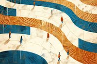 Wandering Waves - Dit menselijk activiteit schilderij toont diverse figuren die wandelen over gestileerde, golvende paden in een dynamisch spel van blauw en oranje tinten, uitgevoerd in een abstracte, grafische stijl.