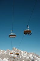 Stoeltjes liften door een helderblauwe lucht, omringt door besneeuwde toppen. De liftlijnen leiden het oog naar boven, waar stilte en avontuur samenkomen.