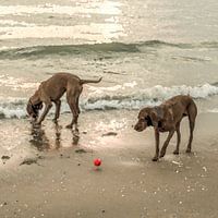 De rechtse hond staat vragend te kijken naar de bal en wacht op de andere hond dat die de bal probeert te pakken.