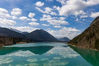 Een fantastisch uitzicht over de turquoise Sylvensteinsee in Opper-Beieren. De prachtige wolkenlucht wordt weerspiegeld in het water en de bergen omlijsten het meer. Een prachtige natuurlijke sfeer, vredig en indrukwekkend.