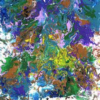 Een acryl flow pour abstract schilderij, met een overheersende basis van elektrisch blauw, maar daarna veelkleurige wervelingen van kleur die door elkaar lopen.