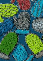 Een kunstwerk met een blauwe achtergrond en een stel verschillende gekleurde wanten.
