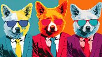 De kleurstellingen zijn helder en gewaagd, wat bijdraagt aan de visuele impact van het werk. De honden zijn gekleed in nette pakken met stropdassen, wat een humoristisch contrast…