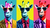 Deze kunstuiting grijpt terug naar de iconische popart-stijl van Andy Warhol, waarbij drie giraffes als modieuze heren zijn geportretteerd.