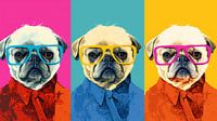Dit kunstwerk is een levendige triptiek die de iconische popartstijl van Andy Warhol eert, met een trio van mopshonden als stijlvolle onderwerpen.