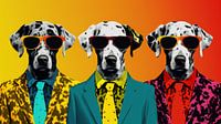 De honden zijn gestileerd met coole zonnebrillen en dragen pakken met een felgekleurde stropdas die contrasteert met hun jasjes. De vlekken van de Dalmatiërs worden…