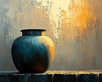 Warm Glow Redux - Dit stilleven schilderij toont een opvallend gedetailleerde, weelderig gekleurde oude vaas op een ruwe houten oppervlakte, badend in een delicaat spel van licht en schaduw die de textuur en kleur variëteiten benadrukt.