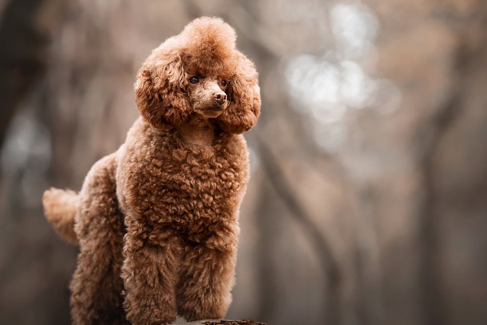 Warm gekleurd herfst portret van een dwerg Poedel hond gefotografeerd op een boomstam in het bos | Natuur portret