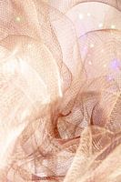 Deze foto toont een macro-opname van een textielstof in delicate roze- en beigetinten. De structuur doet denken aan een fijn net of een luchtige stof die in zachte golven over het beeldoppervlak ligt. De zachte materialiteit wordt benadrukt door de belichting, die door de stof schijnt en de transparantie ervan zichtbaar maakt. Op de achtergrond zijn kleine, gekleurde lichtpuntjes te zien die het beeld extra visuele diepte geven.