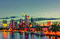 Over ‘Warm schilderij Frankfurt: Skyline achter de Main’ van Slimme Kunst.nl