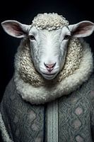 Dit schilderij toont een schaap dat gekleed is in een dik wollen vest met geometrisch patroon. Het boerderijdier is gedetailleerd afgebeeld waardoor het er bijna uitziet alsof het echt is. De wol op het lichaam van het schaap is zorgvuldig geschilderd en heeft een bijzondere textuur. De achtergrond van het schilderij is donker zodat het schaap extra wordt benadrukt. Het kleurgebruik geeft dit grappige en humoristische dieren portret een klassieke uitstraling.