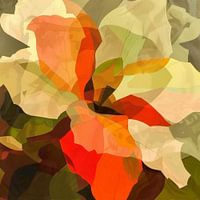 Intrigerende abstracte voorstelling van bloemen, waarbij warme en aardse kleuren de compositie domineren. De bloembladeren zijn weergegeven in tinten van rood, oranje, geel en verschillende schakeringen van groen en bruin. Deze kleuren vloeien soepel in elkaar over, waardoor een gevoel van harmonie en organische eenheid ontstaat. De…