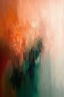 Dit abstracte schilderij toont een krachtige ontmoeting tussen warme oranje en koele groene tinten. Dynamische penseelstreken creëren beweging en energie, alsof twee werelden samensmelten. De rijke textuur voegt diepte toe en nodigt uit tot contemplatie. Het werk roept diverse emoties op, van passie tot introspectie, en suggereert transformatie of innerlijke groei. Balancerend tussen chaos en harmonie, nodigt het schilderij de kijker uit om eigen interpretaties te verkennen en weerspiegelt het de complexiteit van emoties en natuurlijke cycli.