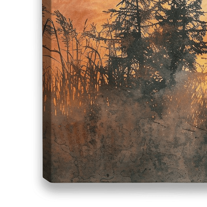 Dit betoverende ontwerp brengt de schoonheid van een zonsondergang tot leven met een palet van warme kleuren die de hemel verlichten. Silhouetten van ranke bomen en zacht wiegend gras vormen een rustgevend tafereel dat doet denken aan de serene momenten vlak voor het vallen van de avond. De zachte overgangen en vloeiende lijnen creëren een gevoel van rust en contemplatie, alsof je deel uitmaakt van dit stille landschap. Een moment van stilte, gevangen in verf, dit werk is een ode aan de eenvoudige schoonheid van de natuur, die de chaos van het dagelijks leven even naar de achtergrond doet verdwijnen.