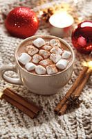 Te midden van glinsterende kerstballen en het zachte licht van kaarsen ontvouwt zich een verleidelijke kop warme chocolademelk. Zachte, smeltende marshmallows tuimelen bovenop, terwijl kaneelstokjes er decoratief naast liggen. De warme, uitnodigende sfeer belooft gezelligheid en feestvreugde, perfect voor gezellige winteravonden.