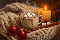 Een vleugje gezelligheid vult de lucht terwijl een dampende kop warme chocolademelk met fijne marshmallows centraal staat. Delicate karamel- en kaneelsmaken dwarrelen rond de kop, terwijl warm licht van een flikkerende kaars en feestelijke kerstballen het tafereel omarmen. Een dik, uitnodigend gebreid patroon maakt het knusse plaatje compleet.