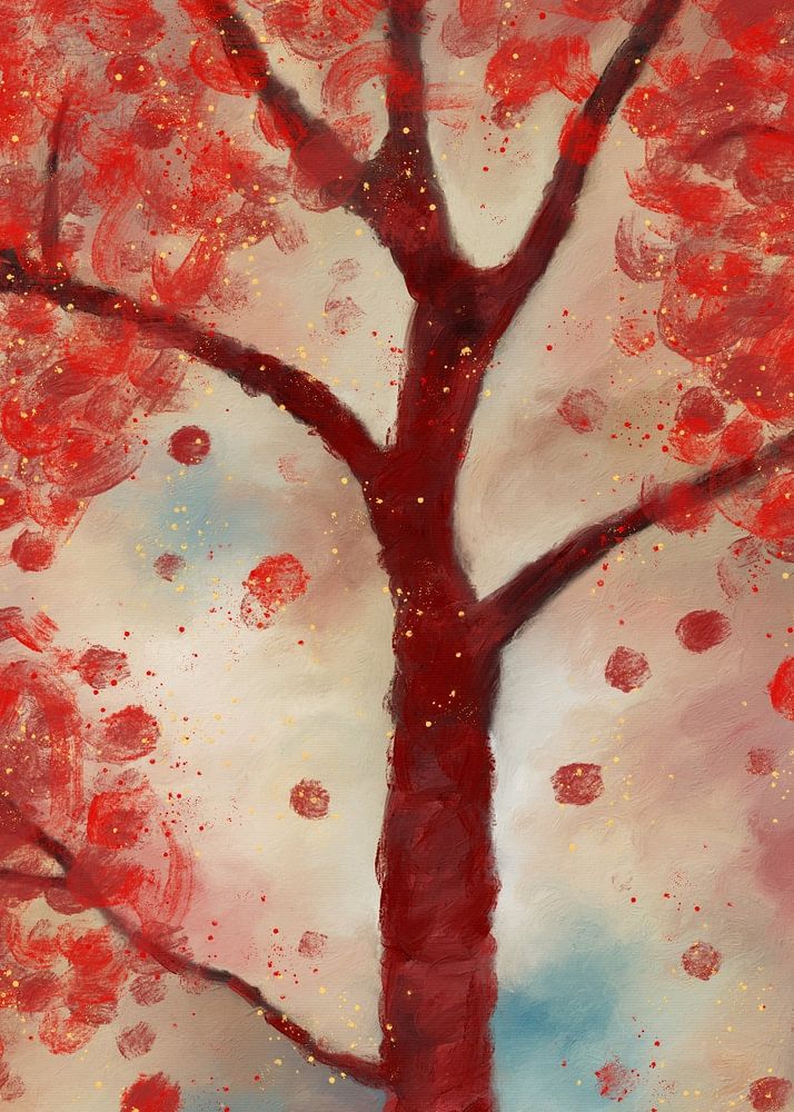 Een levendige boom met een roodachtige stam strekt zijn takken uit naar boven, versierd met een veelheid aan gekleurde cirkels in rood-, blauw- en beigetinten, die een indruk geven van gebladerte. De achtergrond is getextureerd met variaties van beige, bruin en spatten van dezelfde kleuren als in de cirkelvormige bladeren van de boom, waardoor een rijk tapijt van warme tinten ontstaat.