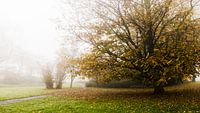 Een boom met vergeelde bladeren staat in het Cramwinckelplantsoen n Purmerend. Onder de boom veel gevallen bladeren op het gras. De omgeving staat in dikke mist. Allemaal tekenen dat het herfst is, en de natuur zich opmaakt voor de naderende winter.