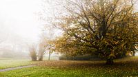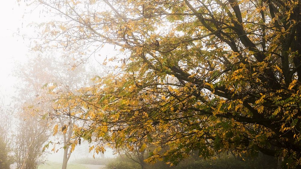 Een boom met vergeelde bladeren staat in het Cramwinckelplantsoen n Purmerend. Onder de boom veel gevallen bladeren op het gras. De omgeving staat in dikke mist. Allemaal tekenen dat het herfst is, en de natuur zich opmaakt voor de naderende winter.