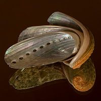 Doordat de schelpen op een spiegelende ondergrond liggen zie je de andere kant van de schelp ook deels in het spiegelbeeld. De olijf en pistachegroen kleurige buitenkant komt in beeld in de spiegelende ondergrond.