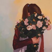 Meisje met bloemen. Verstopt ze zich bewust achter de bloemen? Of is ze onderweg met de bloemen en in gedachten verzonken? Je mag er je eigen interpretatie aan geven.