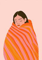Een illustratie van een vrouw die zich warm heeft gewikkeld in een oranje en roze gestreepte deken, geplaatst tegen een zachte roze achtergrond. De stijl van de tekening is eenvoudig en charmant, waarbij gebruik is gemaakt van platte illustraties met gedurfde lijnen en weinig details. Dit draagt bij aan een minimalistische esthetiek die de nadruk legt op helderheid en eenvoud. De warme kleuren van de deken contrasteren subtiel met de rustige achtergrond, waardoor de hele compositie een zachte, uitnodigende sfeer krijgt.