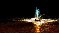 Het was een mooie najaarsdag, zelfs een beetje warm in het zonlicht. De zon stond al lager aan de hemel en loodrecht boven deze fontein. Daardoor werd de achtergrond donker, kreeg het omringende water een prachtige schittering om de fontein heen en stond de fontein zelf in het volle licht. Ik kleurde het water daarom wat warmer oranje…
