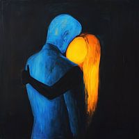 Het kunstwerk warme omhelzing blauwe man en oranje vrouw olieverf schilderij vertelt een verhaal van verbondenheid en contrast. De blauwe man en de oranje vrouw, geschilderd in expressieve olieverfstreken, vormen samen een tedere omhelzing die zowel kracht als kwetsbaarheid uitstraalt.