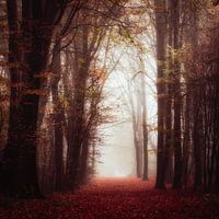 Warme herfstkleuren in een mistig bos