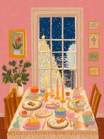 Deze illustratie ademt warmte, gezelligheid en huiselijke rust. Aan een rijk gedekte tafel vol kleurrijke gerechten, kopjes thee en gouden kaarsen voel je de sfeer van een feestelijke winteravond. Door het raam schitteren de lichtjes van een kerstboom buiten, terwijl zachte sneeuwvlokken neerdalen in de nacht. De roze muren, de vintage schilderijen en het subtiele kaarslicht zorgen samen voor een dromerige en nostalgische uitstraling. Alles lijkt even stil te staan, alsof de wereld buiten verdwijnt in een stille, glinsterende winter. De kleuren zijn zacht maar vol leven – tinten van roze, goud, groen en blauw vloeien harmonieus samen. Elk detail vertelt een verhaal van samenzijn, warmte en kleine geluksmomenten. Dit werk vangt het gevoel van thuis zijn tijdens de feestdagen: een tafel vol liefde, herinneringen en het eenvoudige genot van samen eten terwijl buiten de sneeuw valt.