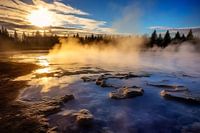 Temidden van de ruige natuur schittert een hete bron in het zachte licht van het gouden uur. De stoom stijgt op en vermengt zich met de warme kleuren van de ondergaande zon, waardoor een sfeer van rust en magie ontstaat. Het beeld nodigt uit tot reflectie en contemplatie, en herinnert ons eraan hoe de krachten van de natuur ons kunnen…