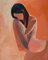De vrouw heeft haar armen om haar benen geslagen en haar hoofd naar voren gebogen, wat een gevoel van introspectie en contemplatie oproept. Het schilderij heeft warme tinten van oranje en rood, die een sfeer van warmte en comfort creëren. Het haar van de vrouw is donker en valt over haar schouders, wat een contrast vormt met de zachte kleuren van de achtergrond. De penseelstreken zijn expressief en dynamisch, wat het schilderij een gevoel van beweging en leven geeft. De abstracte stijl en subtiele textuur voegen diepte toe aan het werk, waardoor de kijker wordt uitgenodigd om de emotionele diepte van de scène te verkennen.