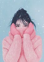 Een gouache-schilderij van een vrouw, gekleed in een warme, roze trui en een zachte sjaal die haar hals omhult. Ze draagt roze wanten, die haar handen beschermen tegen de kou. Op de achtergrond ligt een zachte, ijzig blauwe kleur die een winterse sfeer oproept. De stijl is minimalistisch, uitgevoerd in vlakke, winterse tinten. De compositie is eenvoudig en bevat minimale details, wat de rust en eenvoud van een koude winterdag benadrukt.
