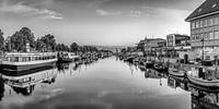 Zonsopgang in de haven van Warnemünde in zwart-wit.