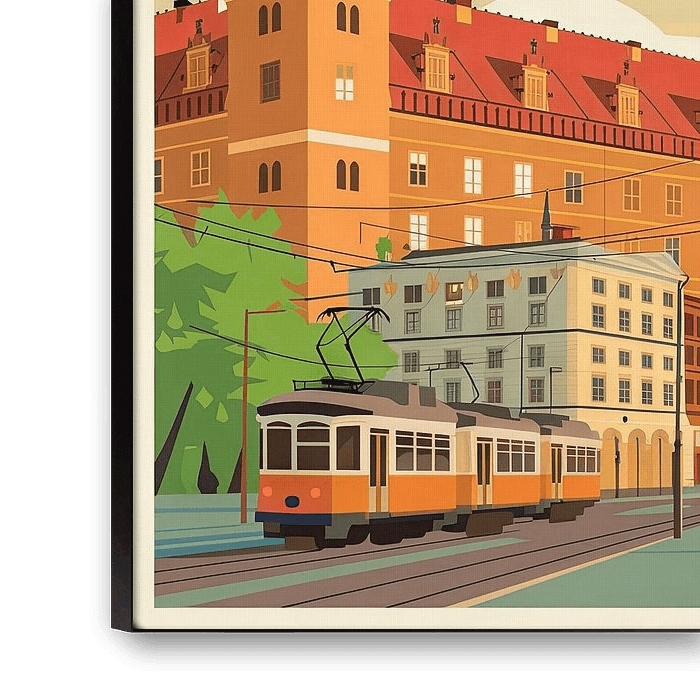 De skyline van Warschau gloeit in warme kleuren, gedomineerd door het majestueuze kasteel met zijn opvallende torens en rode pannendaken. Een nostalgische tramtrein glijdt rustig voorbij, terwijl zachte wolken langs de hemel drijven en de stedelijke sfeer tot leven brengen. Een gevoel van geschiedenis en modern leven komen hier harmonieus samen.