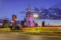 Warschau op het blauwe uur. De voorbijrazende trams en het verlichte Paleis van Cultuur zorgen voor een uniek kleurenspektakel.
