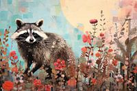 Wasbeer | Bloemenzee | Wasbeer - Hier zien we een charmant, speels schilderij waarin een wasbeer vredig is afgebeeld tussen kleurrijke bloemen en planten. De stijl is een levendige mix van realisme en abstractie, getypeerd door een licht en bijna grafisch gebruik van kleurvlakken die de natuurlijke sfeer onderstrepen.