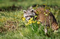 Wasbeer (Procyon lotor) op een weiland achter bloemen kijken van Maren Winter