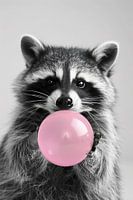 Een schattige wasbeer blaast een grote roze kauwgomballon op. De close-up toont de vacht en expressieve ogen van het dier in detail.