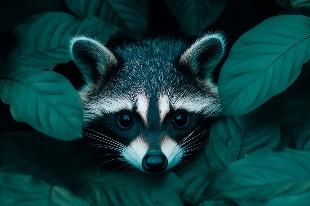 Een mysterieuze blik schemert door de dichte, groene zee van bladeren. De felle, maskerachtige gelaatstekeningen van een wasbeer trekken de aandacht, terwijl de omringende variëteit aan planten oplicht in zachte tinten donkergroen. Deze schuwe soort lijkt zowel een toeschouwer als een deel van de natuur te zijn, verborgen en toch alomtegenwoordig.
