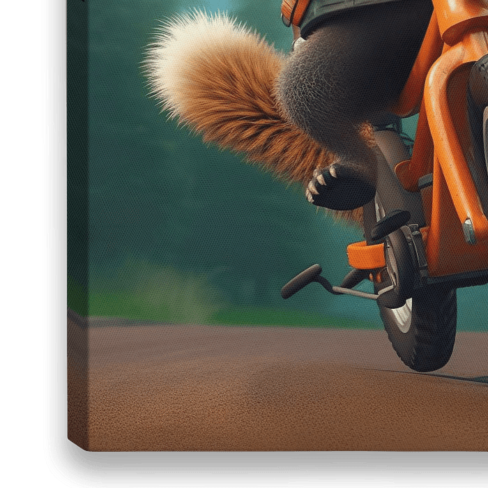 In dit charmante tafereel voor een kinderkamer prijkt een lachende wasbeer, zijn ogen stralen van plezier, terwijl hij vrolijk op een scooter rijdt. Zijn rode en witte vacht wappert in de wind terwijl hij met een brede glimlach het avontuur tegemoet rijdt. De scène brengt een gevoel van levendige opwinding en knusse blijdschap, perfect…