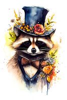 Een elegante heer in pak met een strikje en een flitsende hoge hoed op zijn hoofd. Maar wat deze heer onderscheidt is zijn dierlijke aard: hij is een wasbeer! Deze illustratie is uniek en origineel, een mix van natuur en elegantie die de kijker zal verbazen.