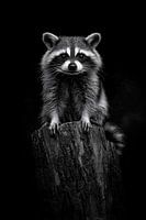Een ondeugende wasbeer, neergestreken op een verweerde houten boomstam, springt in het oog met zijn grote, nieuwsgierige ogen en opvallende gezichtsmasker. Het zwart-wit contrast geeft de afbeelding een mysterieuze uitstraling die levendige gesprekken in een woonkamer kan stimuleren. Ideaal als warm accent met een vleugje natuur.