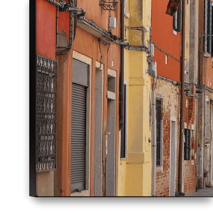 Stel je een levendige, smalle straat voor met aan weerszijden kleurrijke gebouwen met levendige tinten pastelroze, geel, beige en oranje. De gebouwen zijn oud maar charmant, met afbladderende verf die karakter toevoegt. Ramen staan open en balkons zijn versierd met potplanten.