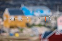 Een typisch Groenlands tafereel: een waslijn met wasknijpers (met her en der de namen van de drager van de was) in het dorp Saqqaq in Disko Bay, Groenland. Op de achtergrond zijn de kleurrijke huizen van het dorp te zien.