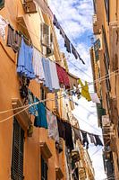 In de oude stad van Corfu wappert de was tussen pastelkleurige gevels. Een herkenbaar en levendig tafereel dat het alledaagse leven op het eiland vastlegt in volle zon en kleur.