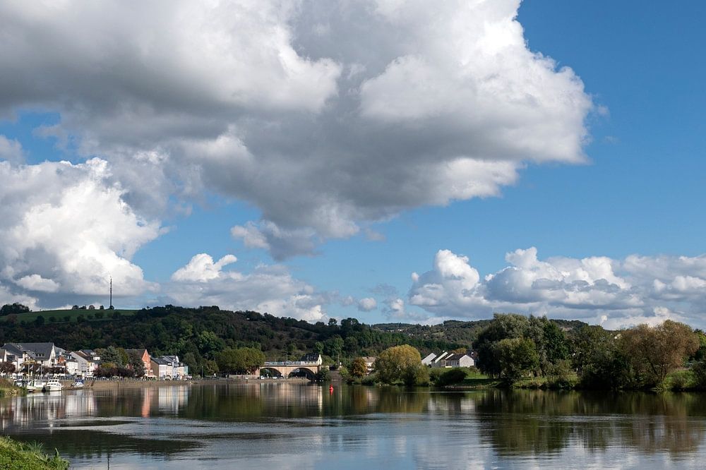 Wasserbillig Luxembourg Huge puffy clouds reflected in the waters of the River Moselle. On the banks a cycle path leads onwards towards Germany in the distance.