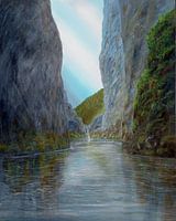 Het originele schilderij is een groot formaat olieverfschilderij, zorgvuldig vervaardigd met de artistieke techniek 'olieverf op doek'. Het is gemaakt in de stijl van een ander werk van de kunstenaar, waarbij het archaïsche motief van een 'kloof met een waterloop omringd door hoge rotswanden' in verschillende stadia…