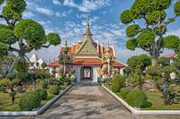 De beroemde ingang van de Tempel van de Dageraad aan de oever van de rivier in Bangkok.