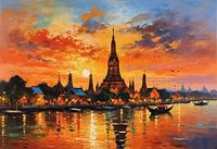 De sierlijke torenspits van Wat Arun verheft zich als een juweel boven de Chao Phraya in Bangkok, glinsterend in ivoor-, goud- en rozetinten als het licht verandert. Impressionistische streken benadrukken ingewikkelde patronen terwijl zachte rimpelingen in de rivier de majesteit weerspiegelen. De lucht is geborsteld met lavendel en koraal, waardoor de tempel een stralende gloed krijgt. Dit kunstwerk brengt zowel spirituele eerbied als het bruisende leven van de rivieroevers van de stad over, waarbij sereniteit en energie samenkomen in één lichtgevend tafereel.